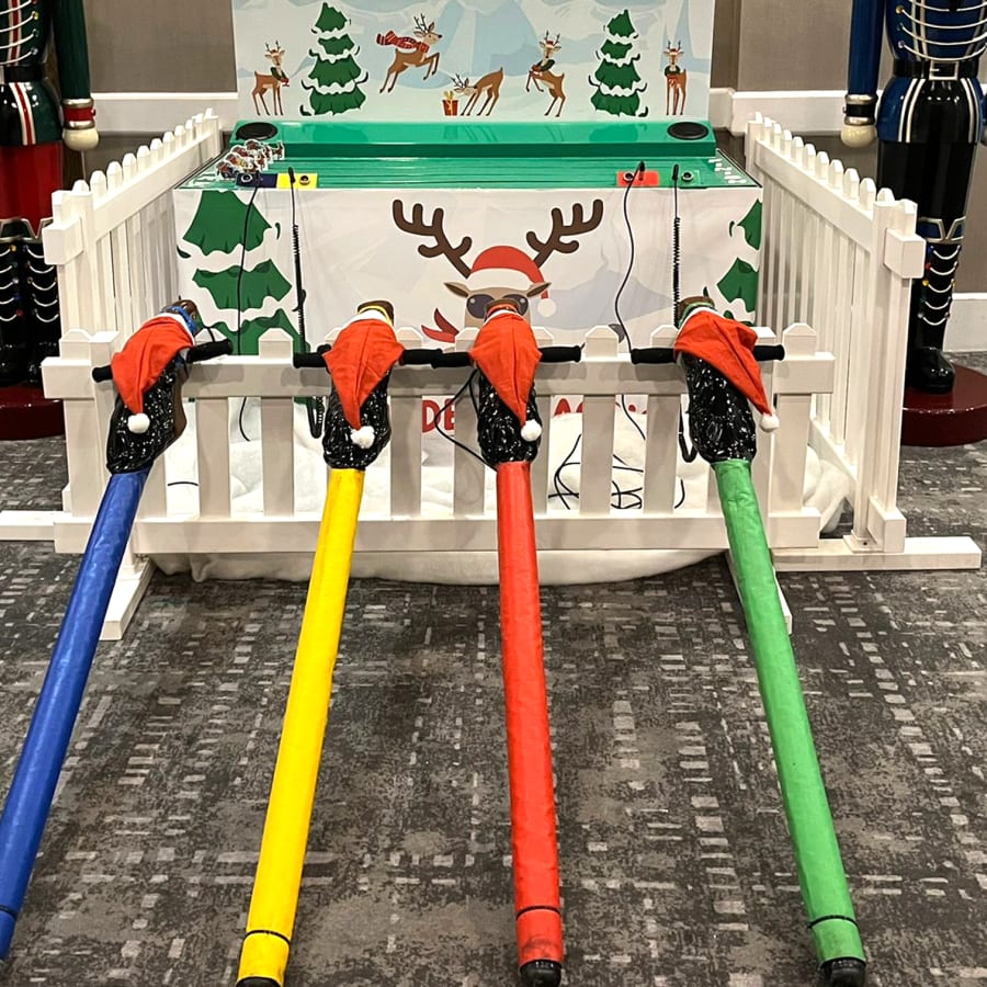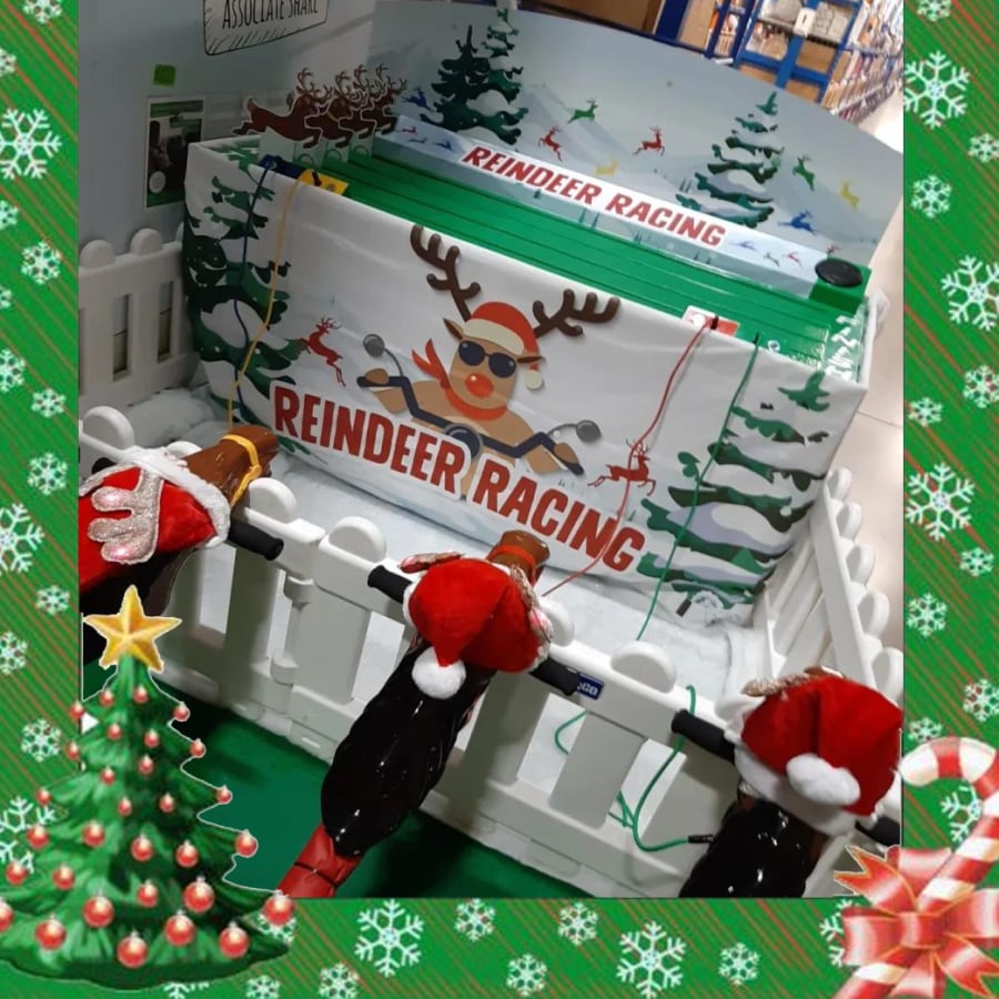 There are 4 different coloured reindeers on the race track, blue, yellow, red and green, and these match the 4 different horses that each player uses. The player places their chosen colour horse in between their legs, holding on with the handles each side of the horses head and when the race starts, simulate a riding motion just like a jockey would. The faster they gallop, the faster their horse will travel along the race track. The first player to cross the finish line, wins.