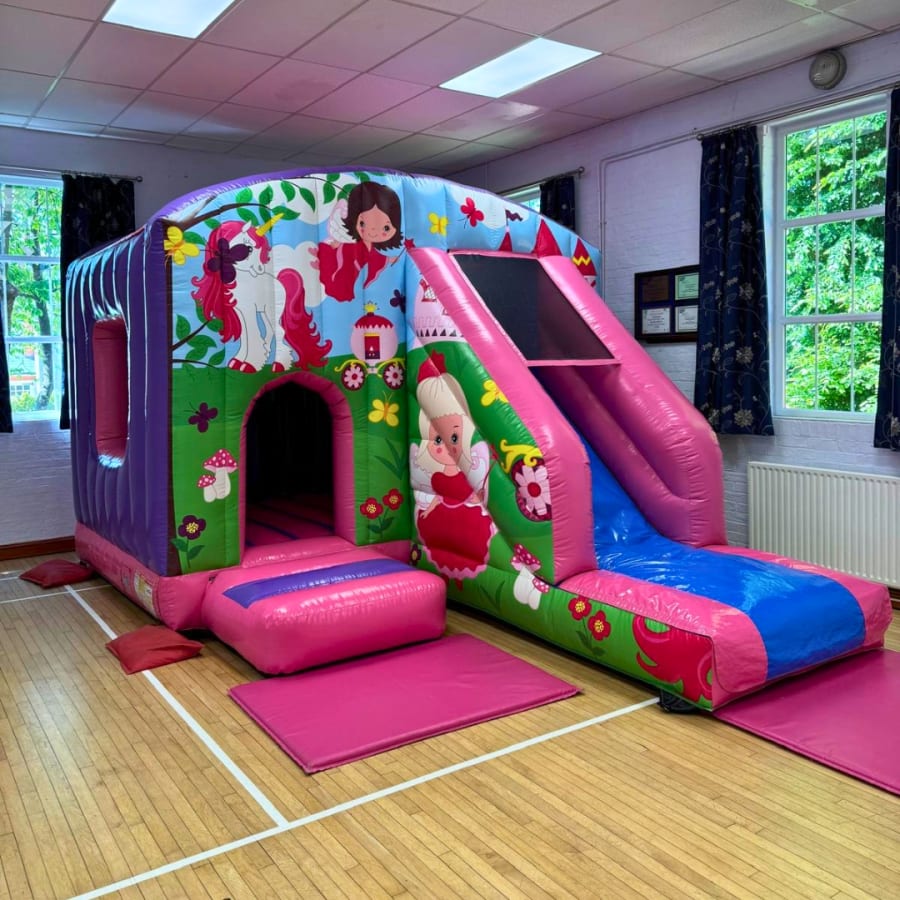 Our brightly coloured new Princess & Unicorn Slide / Castle Combo Inflatable is perfect for your little Princess's parties.