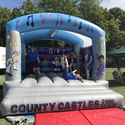 Adult & Kids Bouncy Castle in a Disco Theme. This is a relatively big castle so will accommodate a larger number of people than most castles. Great for large gardens and indoor hall hirings.