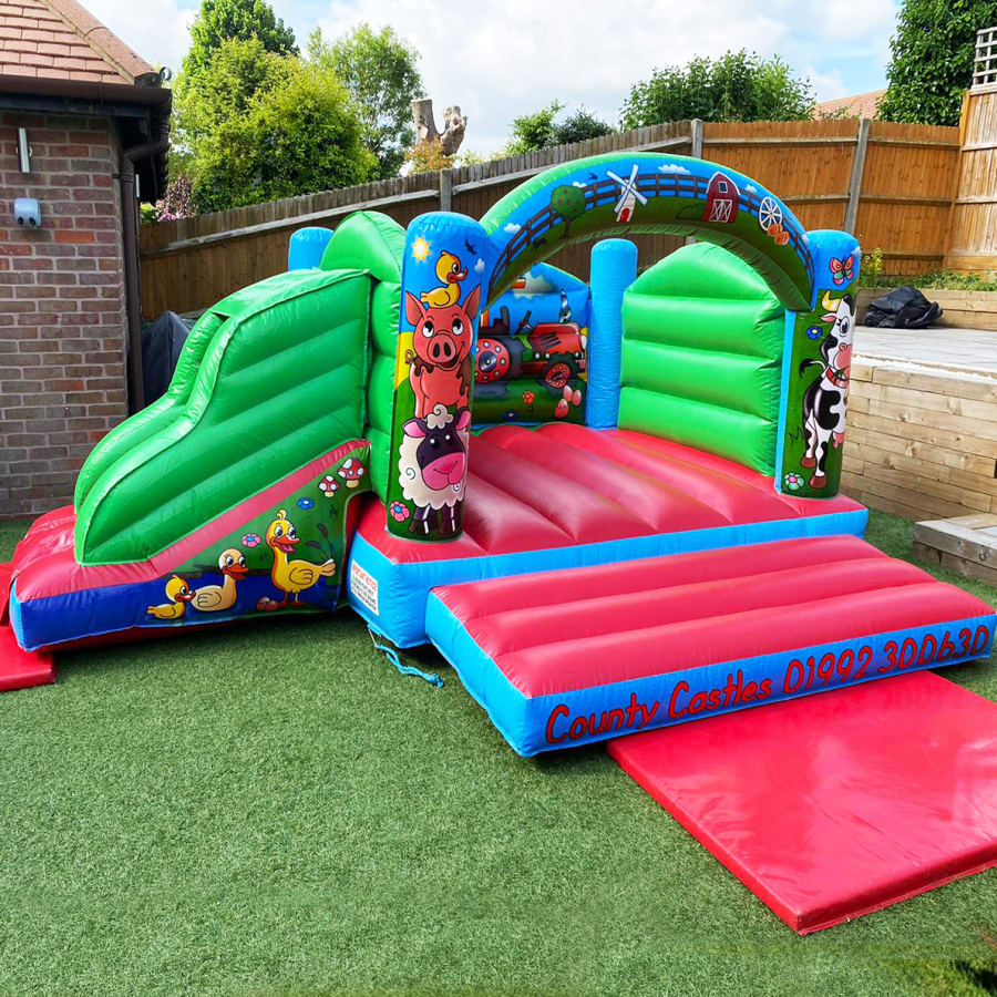Our Tiny Tots Farmyard Bounce and Slide Castle is ideal for Toddlers and smaller children 1m and under. They will love jumping around the farm with all their favourite animals, squealing with delight, and it makes the perfect addition any Birthday Party or Family gathering.