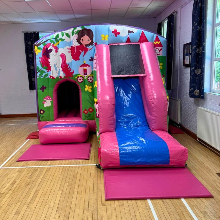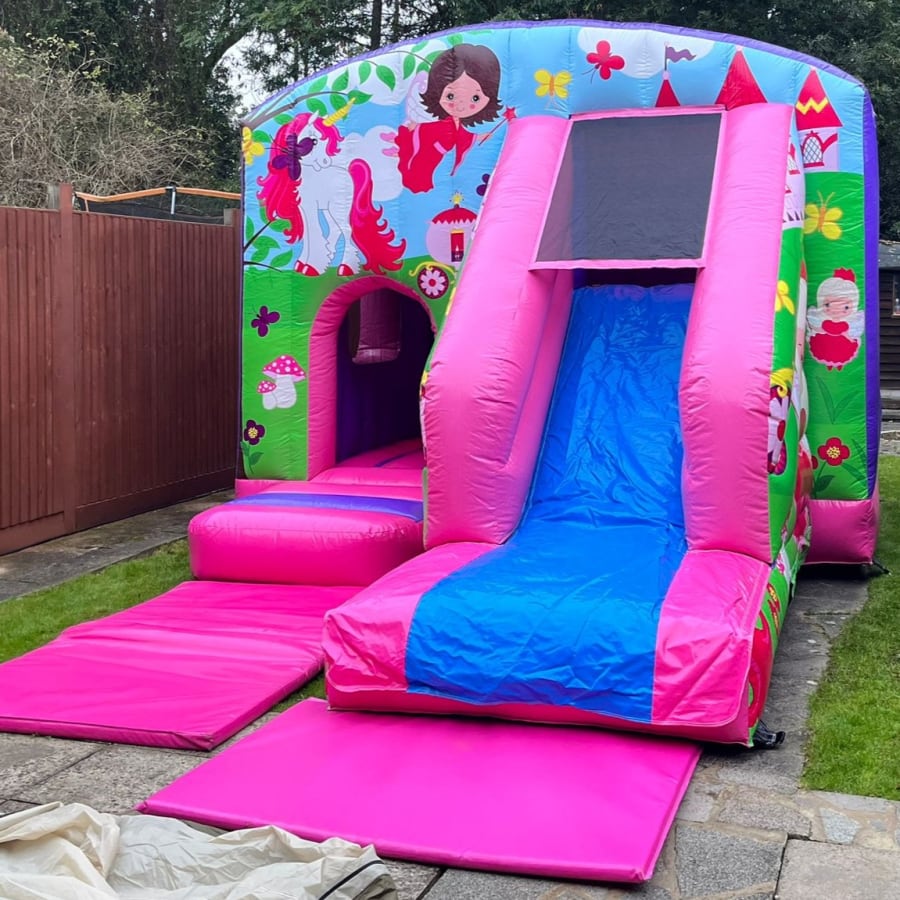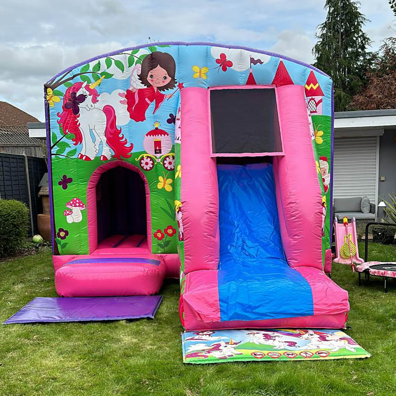 Our brightly coloured new Princess & Unicorn Slide / Castle Combo Inflatable is perfect for your little Princess's parties.