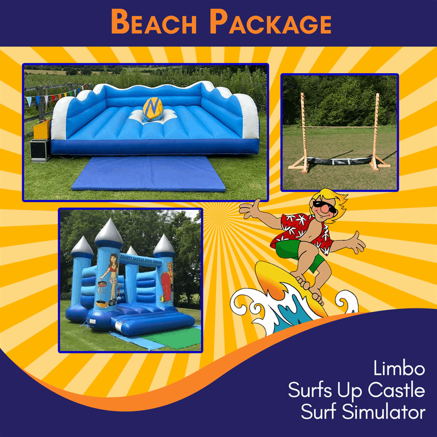 Perfect for both kids and adults, this package includes an Inflatable Surf Simulator, a Surfs Up Inflatable Castle & Limbo game. Whether you're hosting a birthday party, corporate event, or any other gathering, this package will add excitement and entertainment to your event.