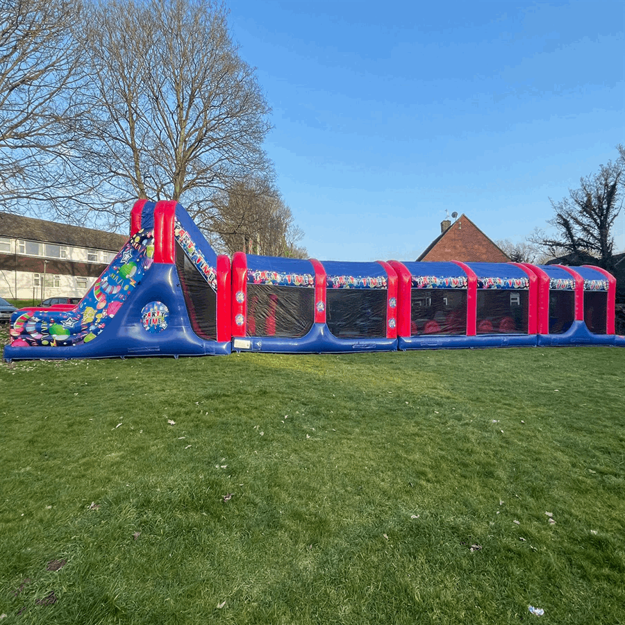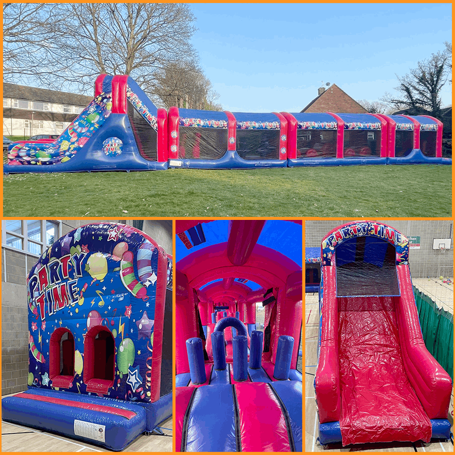4-Piece Party Time Assault Course. Take on the challenge with our 4-piece party time assault course. This inflatable obstacle course is designed for maximum excitement and adventure. Race your friends and family through slides, and obstacles to see who will come out on top!